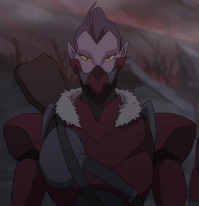 She's dressed for combat and subterfuge in the direst of environments. She wears full-body maroon armour with prominent shoulder pads, a fur-lined hood, and multiple utility straps for weaponry and supplies. For the low-oxygen atmosphere of the volcanic planet on which she hunts Team Voltron, she dons a breathing mask. The mouthpiece is bulbous and maroon, connected to the jawpeice which wraps around the back of her head, via stretchy, grey material.