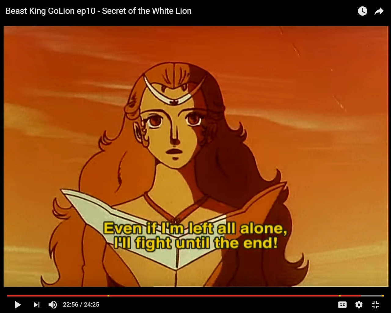 Keith brings the team into attack formation and leads the assault himself, firing off a barrage of missiles and managing to hit with one of them, albeit for little damage due to the robeast's Titan Body Armour. The other men's Lions offer similar harassment, yet then Princess Allura requests that - as she was the one who started this mess - she be the one to deal with the robeast. Nearly a mile up in the sky by this point, the Princess sets her controls to dive and plummets toward the Loathsome Lion...yet is shocked to find the face of her mother superimposed over its feline features!