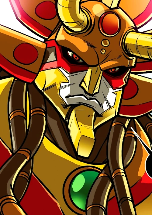 The sphinx is covered in gold, yellow, green, and red plated material on his head, torso, and limbs, while other parts of his body are covered in brown material. His head seems to be fused wit the ornate golden and red spiked crown adorning it, and he has two yellow horns that protrude from his forehead. The sphinx has a set of white teeth and red eyes.